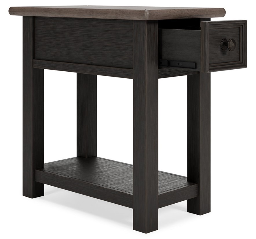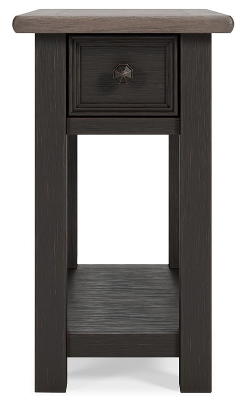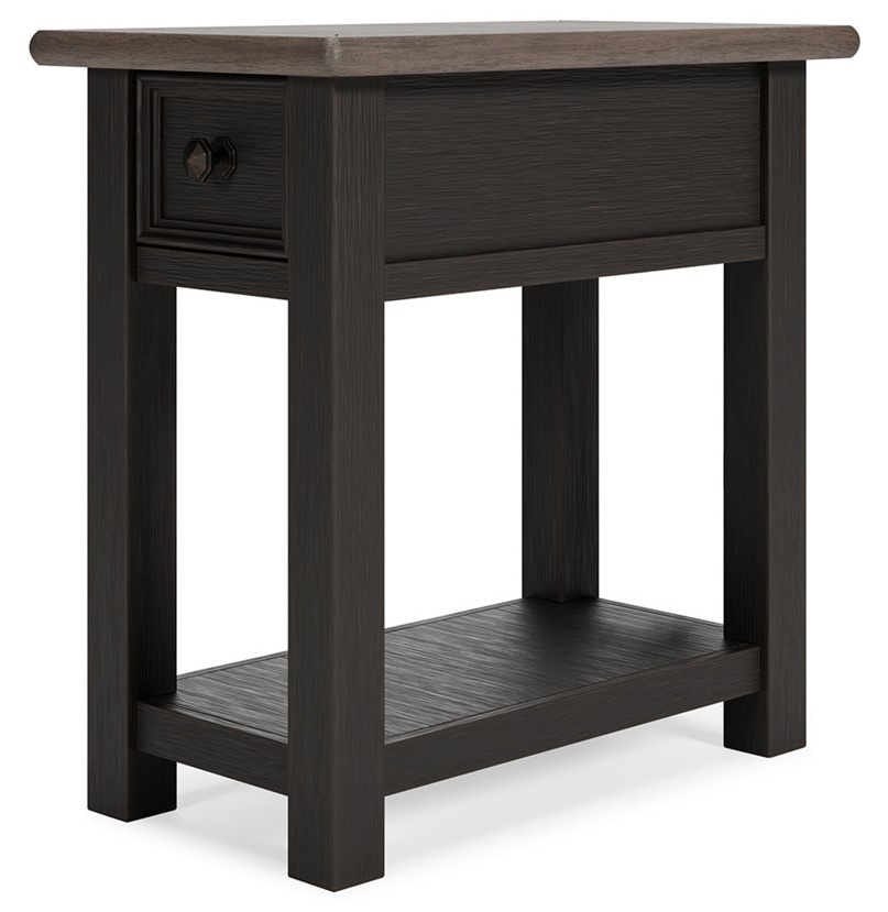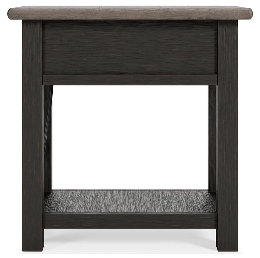 Quality crafted and richly styled, this rectangular chairside end table is sure to charm. Two-tone aesthetic pairs a weathered grayish brown tabletop with a textured wire brushed base in black with rub-through effect. Built-in shelf offers handy display space. Integrated 110V power supply with dual USB charging ports makes it so easy to your personal devices powered up.